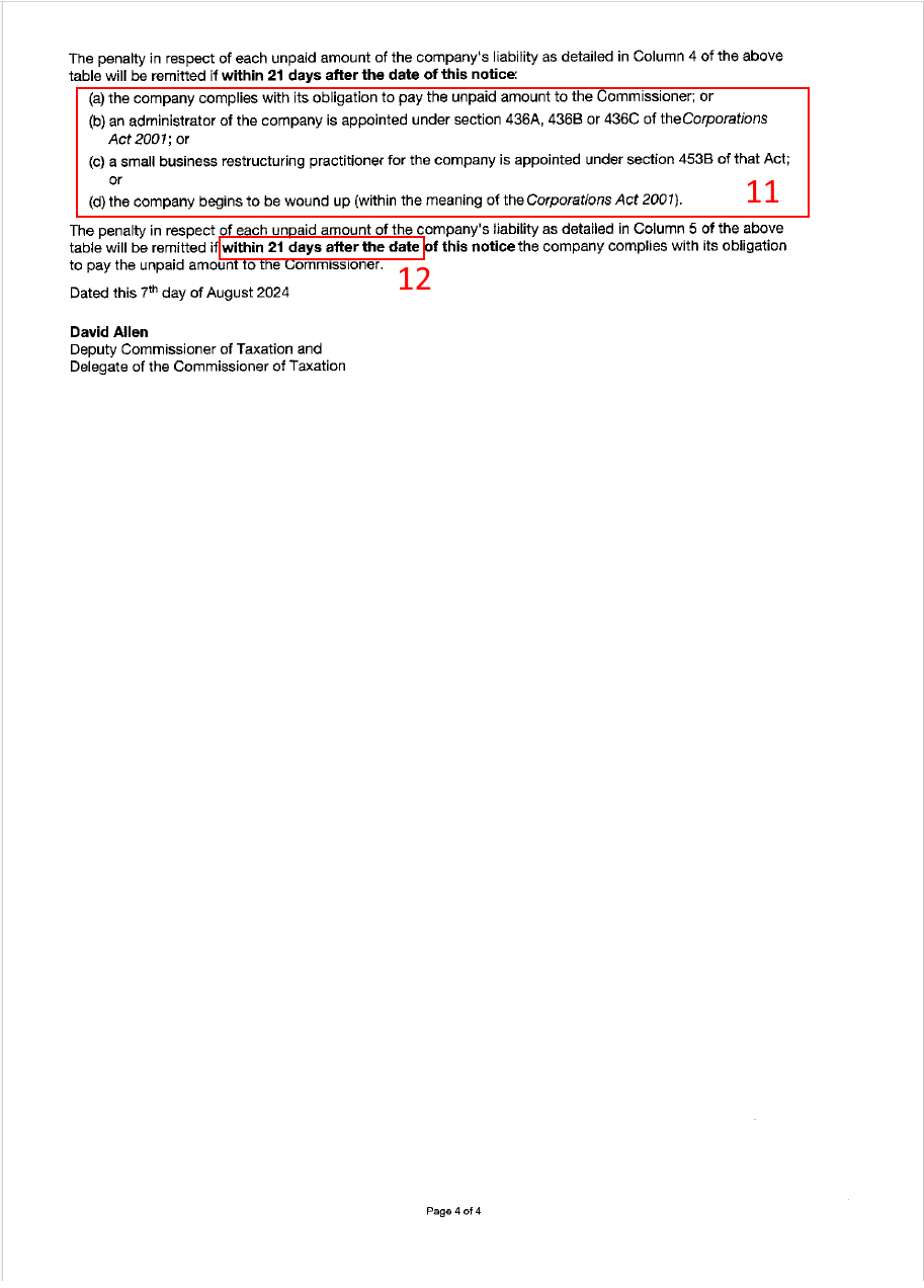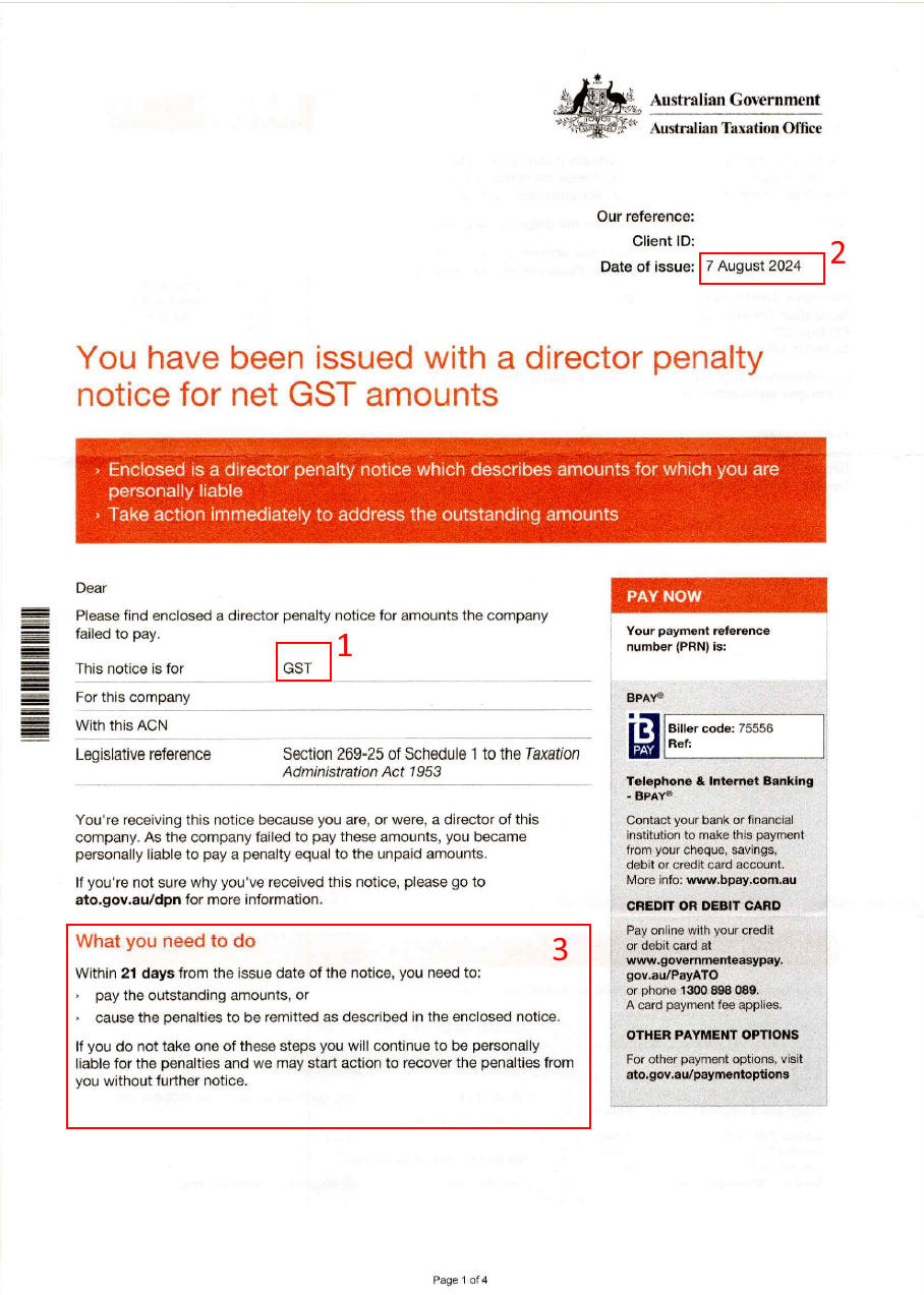 The DPN shown below is for outstanding GST amounts, however there are also DPNs for Superannuation Guarantee Charge and PAYG Withholding. Each type of DPN is issued as a separate letter, so if you receive a GST DPN and there is also superannuation and PAYG withholding owing on the account, you will likely receive 3 letters in total. Generally these are issued at the same time. These are the key tax obligations that can trigger personal liability for directors.