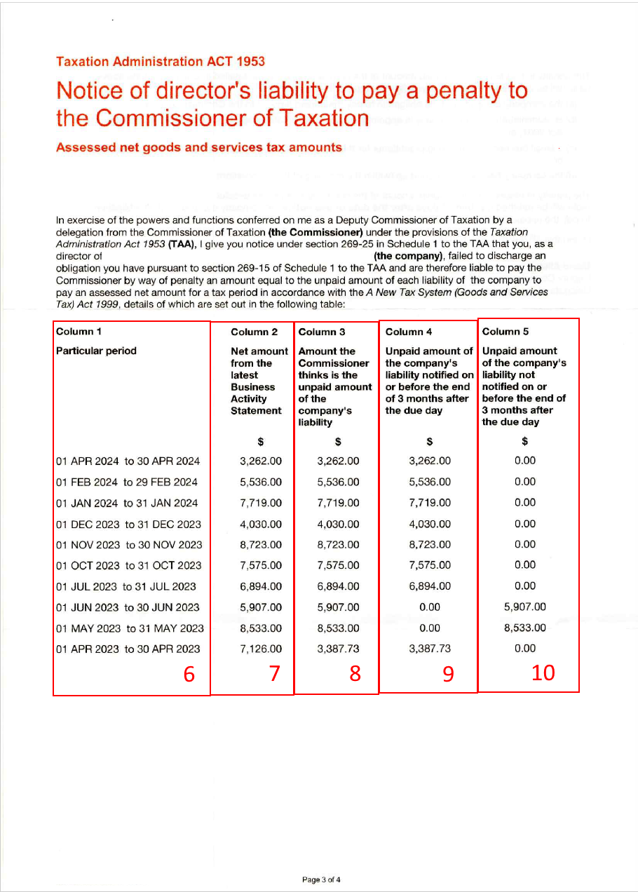 Column 1 lists the periods that the DPN applies to. The ATO may not issue a DPN for the full debts, and may only issue for particular periods. This means that a director may get subsequent DPNs for periods outside of the periods listed in this DPN.